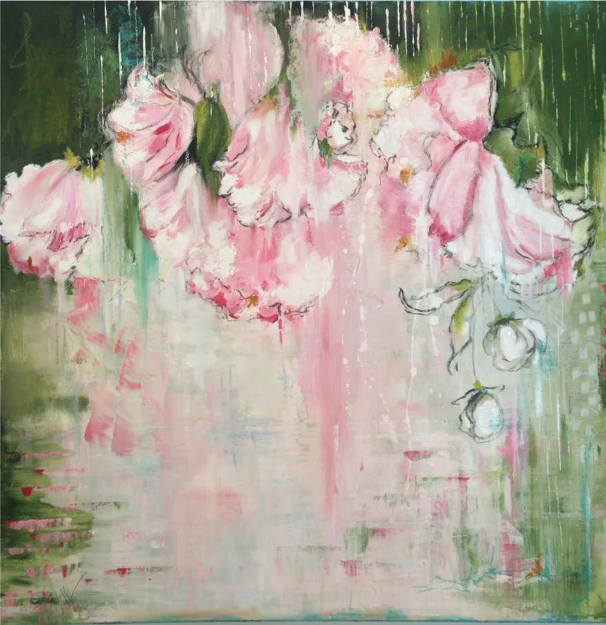 peonies off the patio- Acrylic, pastel and oil on canvas. 24x24 $895 - sold